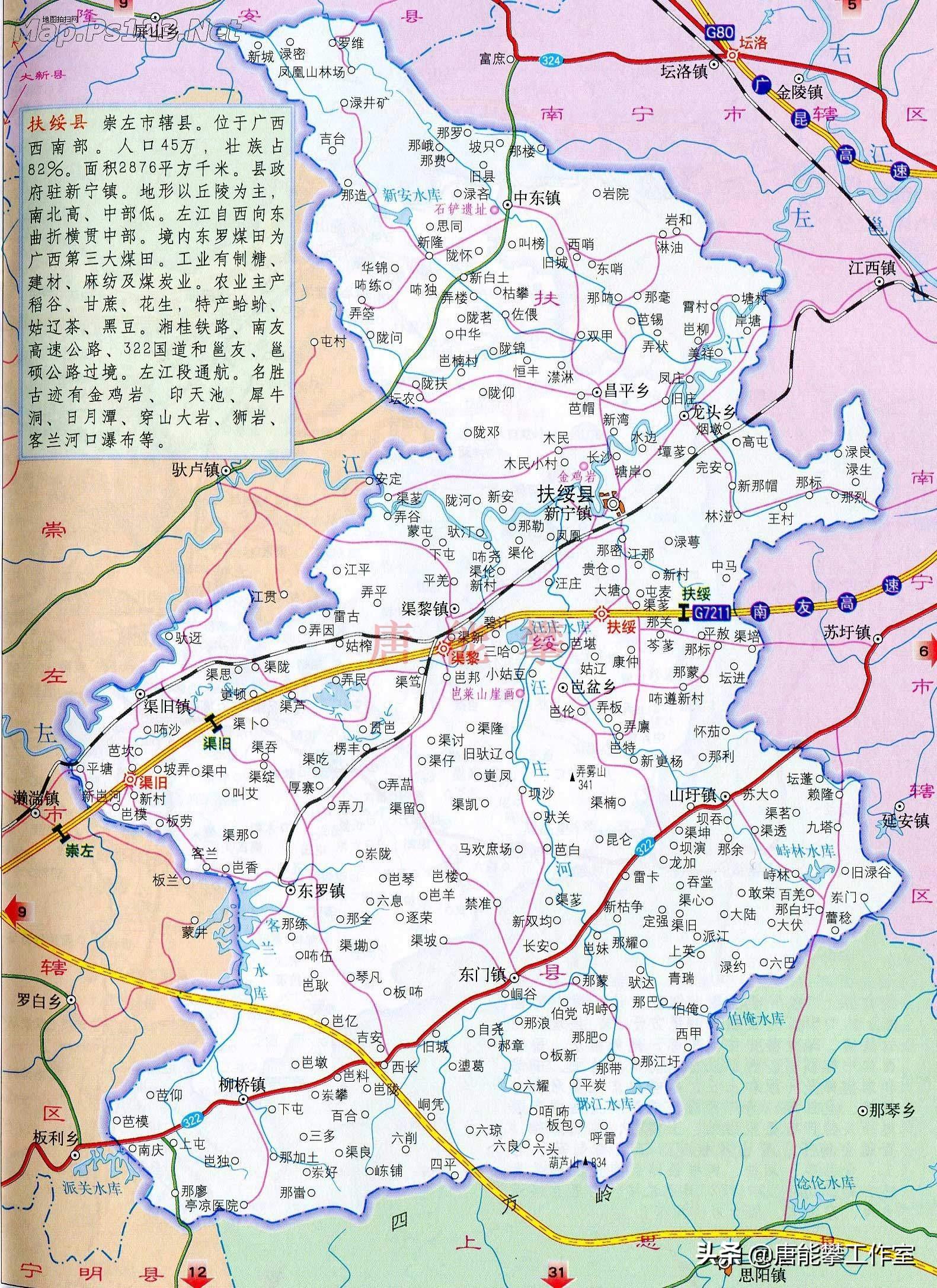 2015年,崇左全市户籍总人口248.80万人,常住人口205.45万人,城镇人口74.54万人。崇左市境内山环岳绕,丘陵起伏,山多地少,地貌复杂多样,以喀斯特岩溶地貌为主体。西部为大青山山脉,南部为公母山山脉和十万大山余脉。地势大致呈西北及西南略高,向东倾斜,中部被左江及支流切割,形成错综合颁的丘陵平原。境内最高峰为南部宁明县与防城港市接壤的十万大山余脉浦龙山,海拔1358米,其次是爱店附近中越边境的公母山,海拔1357.6米。宁明县有8座山峰海拔公里以上。公里以上的其他山峰有北部的大新县与天等县交界的泗城岭,海拔1073.7米,东北部江州区与隆安县交界的的西大明山,1071.2米,南部龙州县的大青山1045米等。