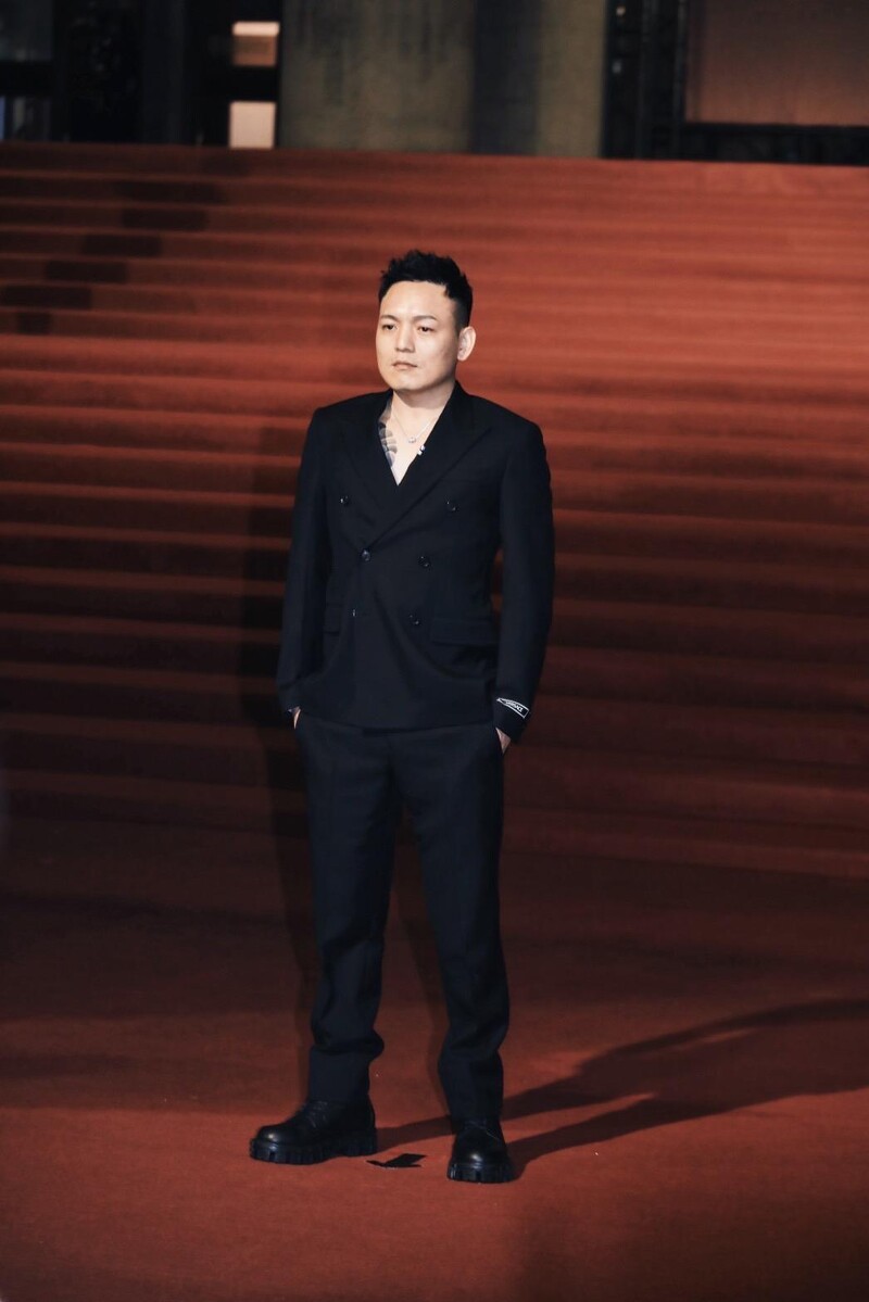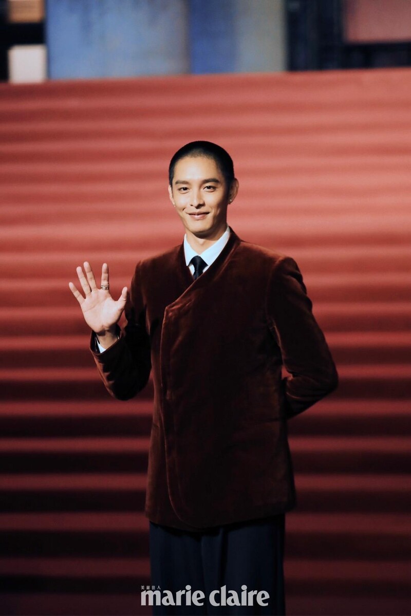 曹佑宁今晚身穿Emporio Armani 2023秋冬系列的天鹅绒西装,担纲红毯主持,深橘色与无领的设计都跳脱了制式的框架,脚踩Christian Louboutin漆皮短靴,搭配上他的帅气寸头,更显型格。