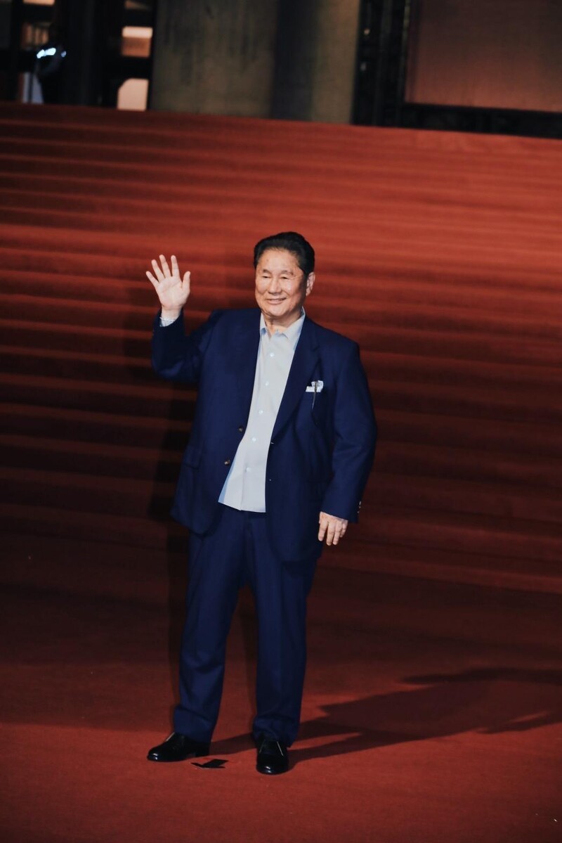 名导北野武获邀来台担任本届金马奖的颁奖人,他以深蓝色西装踏上红毯,一出场就带着慑人的气势。