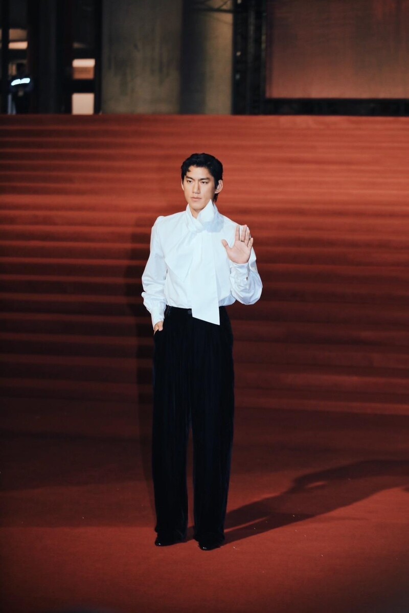朱轩洋穿着Saint Laurent 2023秋冬系列造型走上红毯,他捨弃了外套,仅以白衬衫搭配裤装,衬衫领口部分绑成巨型的扭结,细看微缩口的手袖,会发现朱轩洋散发着贵族公子的气息,是红毯上很少见的造型。