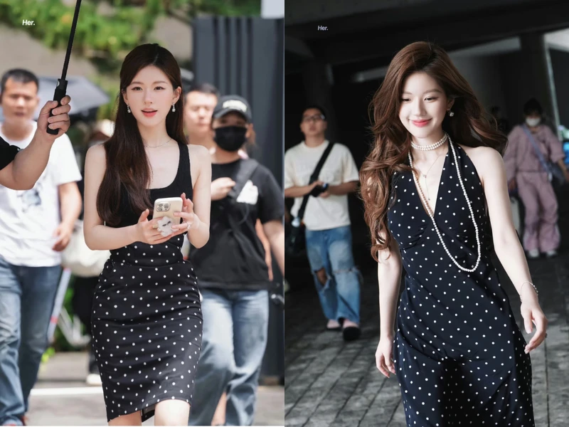 洋溢着法式氛围的复古波点元素,也出现在许妍的造型中,无论是波点包臀铅笔裙,或是连身洋装,都能让人一秒化身气质女伶,而黑底白点也是我们普通人能放心尝试的。